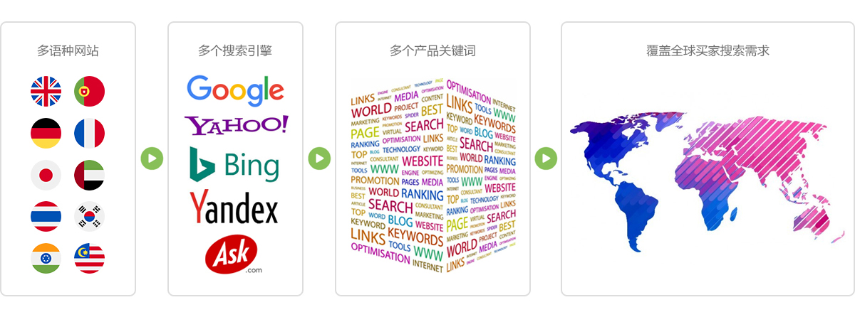根據(jù)您的目標(biāo)市場選擇合適的全球貿(mào)易通網(wǎng)站語種,我們?yōu)槊恳粋€英文關(guān)鍵詞擴(kuò)展為多個不同語言的關(guān)鍵詞,同時面向多個搜索引擎進(jìn)行推廣營銷,力求占領(lǐng)用戶在全球各個國家的搜索排名。